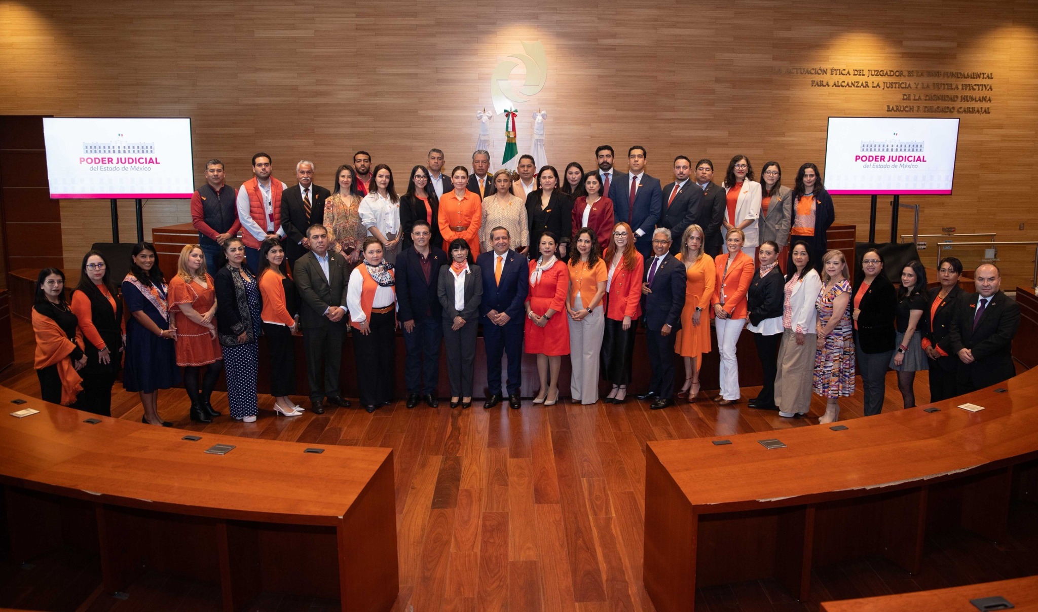 Al acto asistieron integrantes del Órgano de Administración Judicial, representantes de Unidades de Igualdad de Género de la Gubernatura, de las Secretarías de las Mujeres, de la General de Gobierno, de Finanzas, de Salud, del Trabajo, del Bienestar, de Educación, Ciencia, Tecnología e Innovación y del Medio Ambiente y Desarrollo Sostenible; del ISSEMyM, del Tribunal de Justicia Administrativa, el Tribunal Electoral del Estado de México, la Fiscalía General de Justicia, la Comisión de Derechos Humanos, el Instituto Electoral, del Instituto Mexiquense del Emprendedor, CEDIPIEM, entre otras, quienes refrendaron su voluntad de seguir impulsando una cultura de respeto, equidad y justicia.